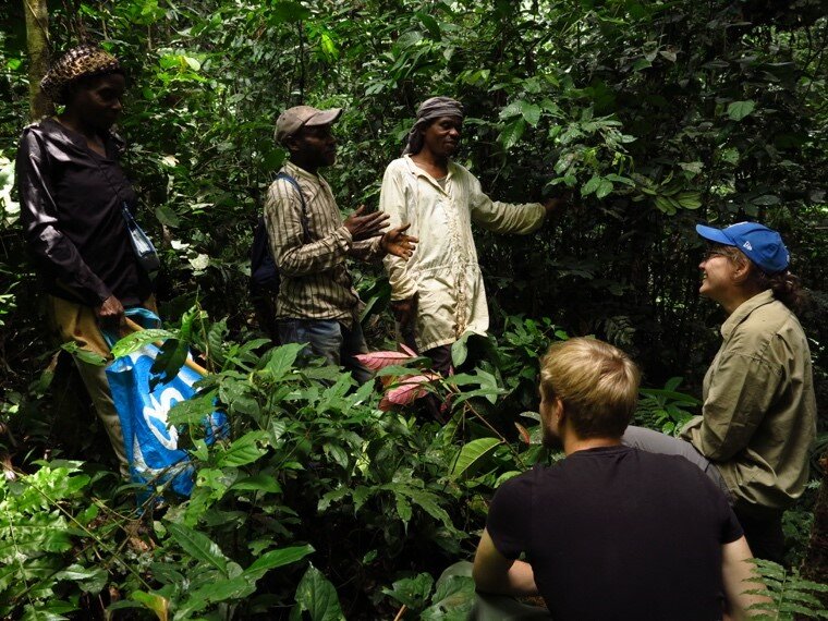 Van Andel and Heger discuss with Baka field guides in the forest. Picture: S. Gallois.